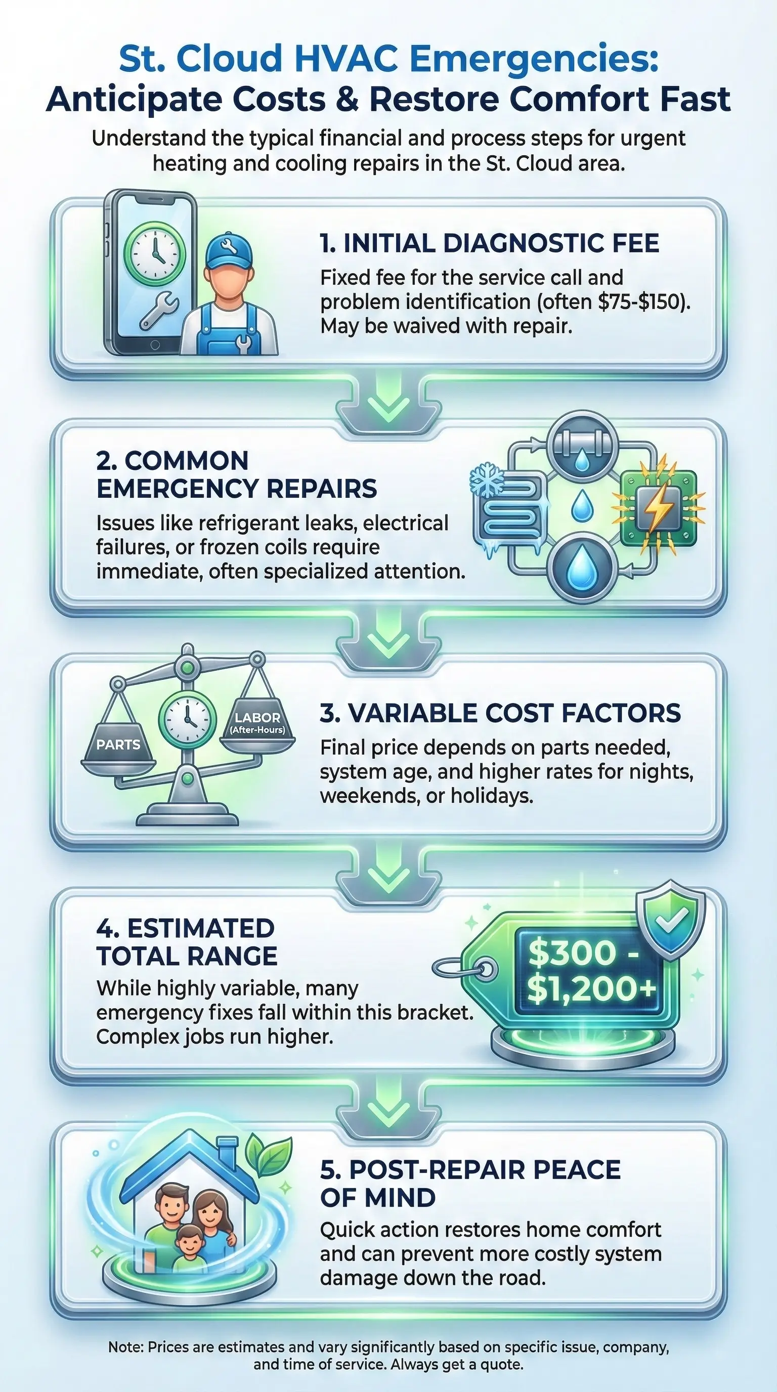 Emergency HVAC costs in St. Cloud run $150-$350 for service calls plus $500-$2,500+ total for repairs.